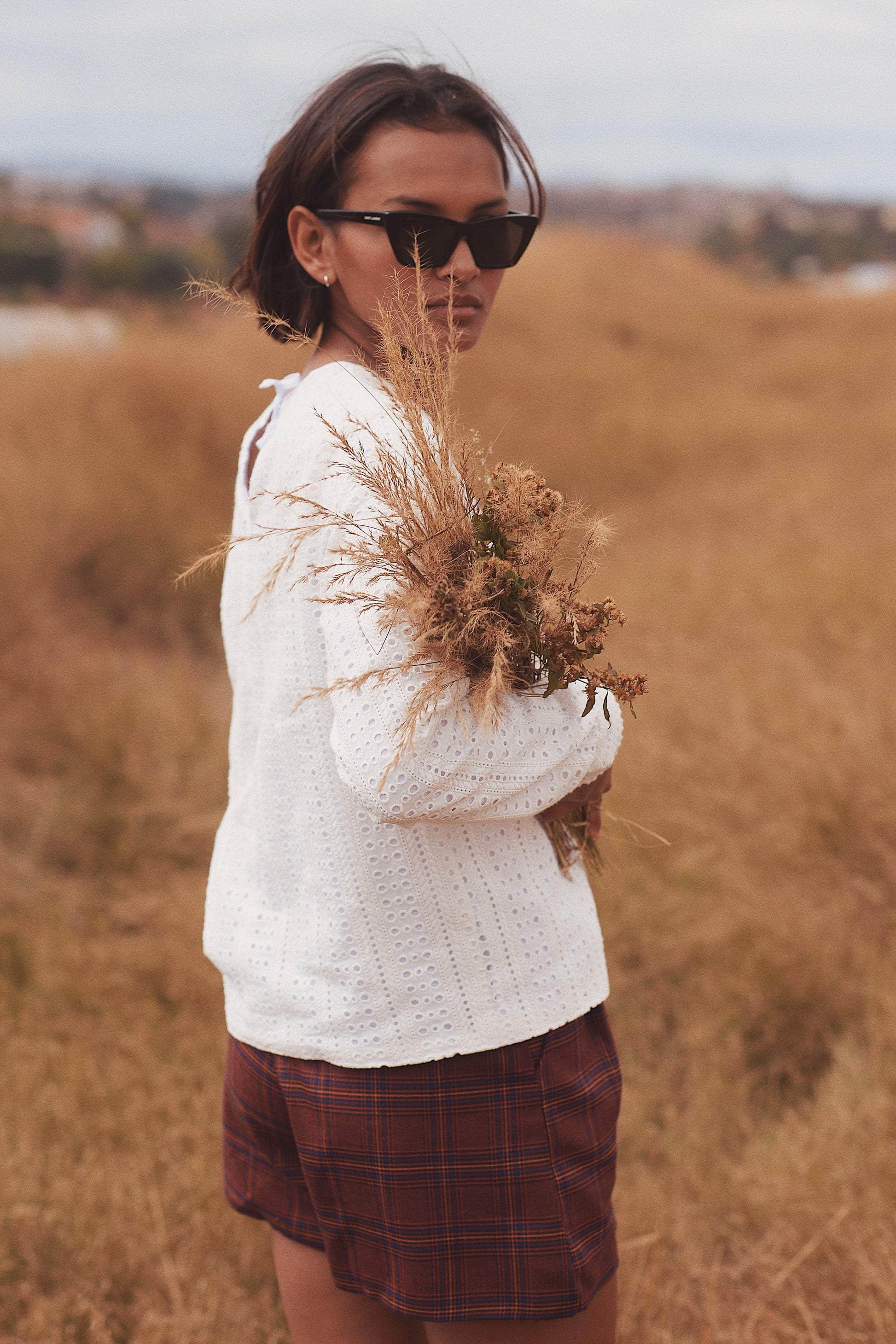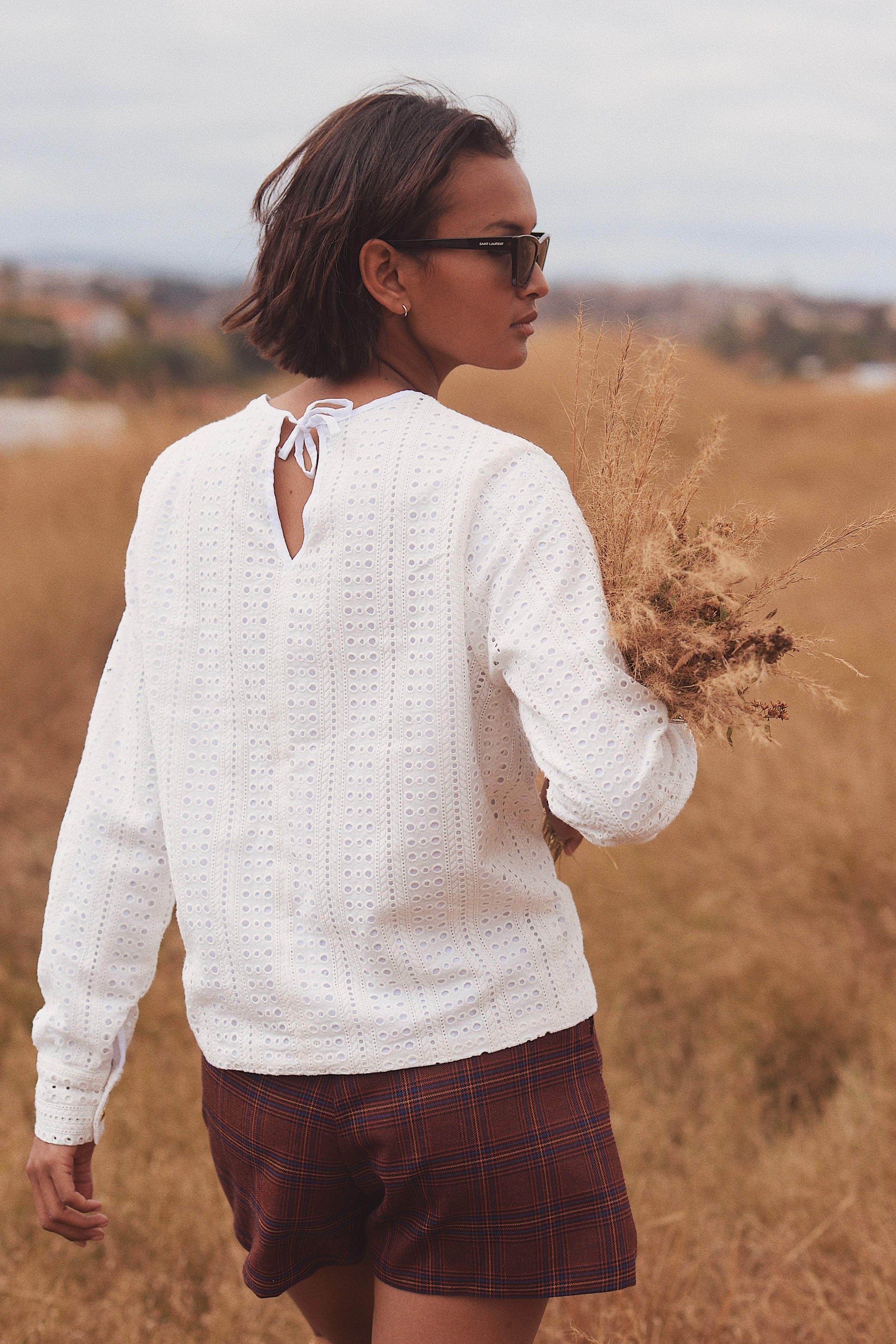 Blouse blanche à motifs brodés, inspirée des détails artisanaux qui font la signature de Zilberte.