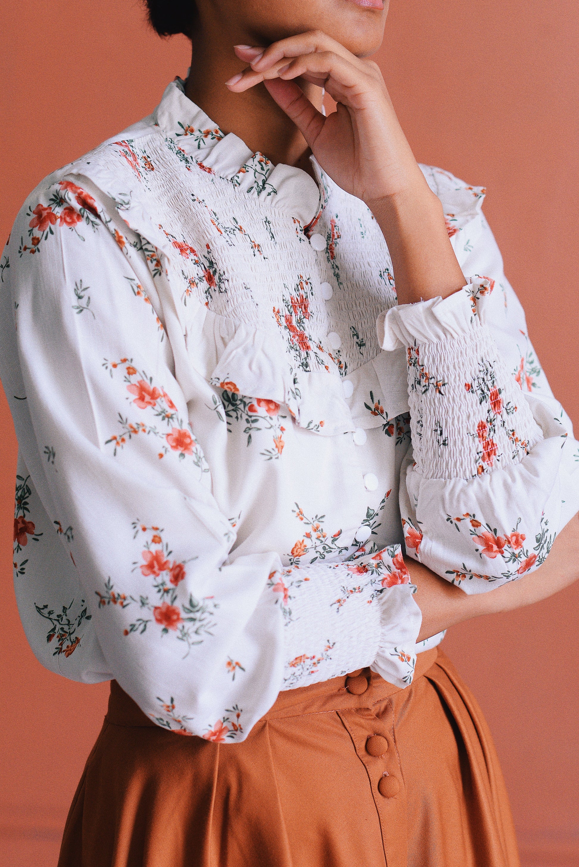 Blouse blanche à imprimé fleuri, délicate et féminine.