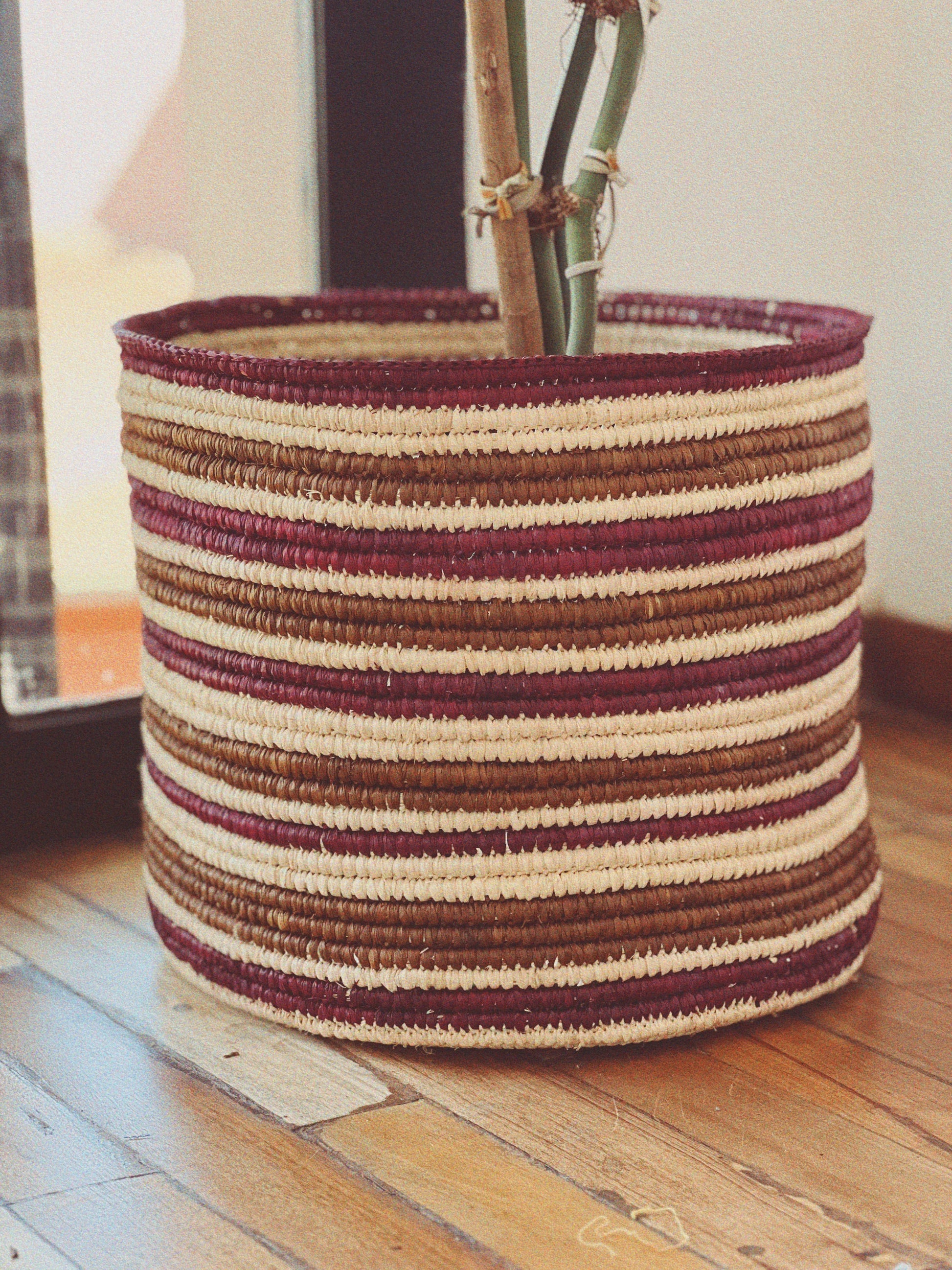 Cache-pot en raphia naturel, tressé à la main dans des tons beige, bordeaux et marron.