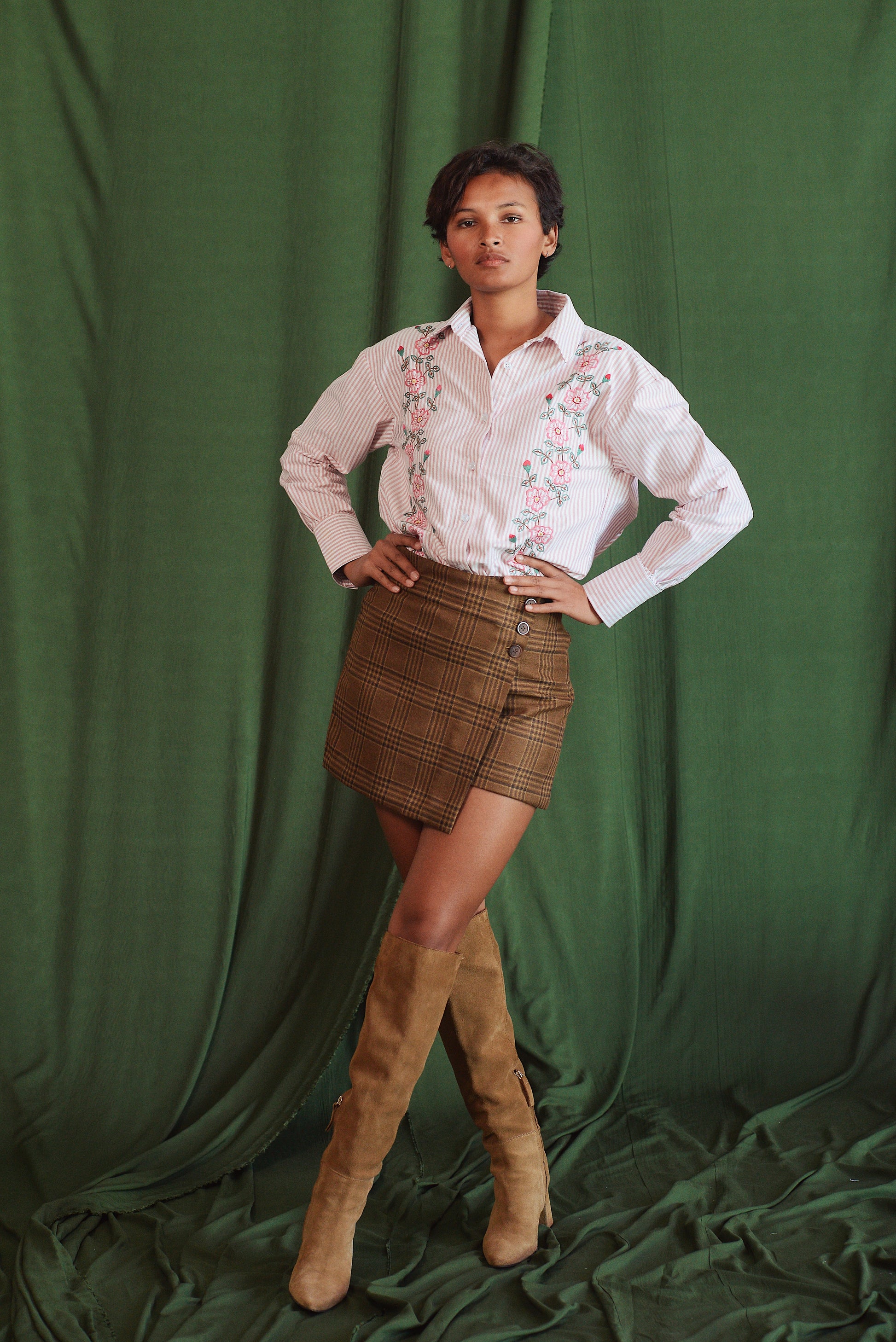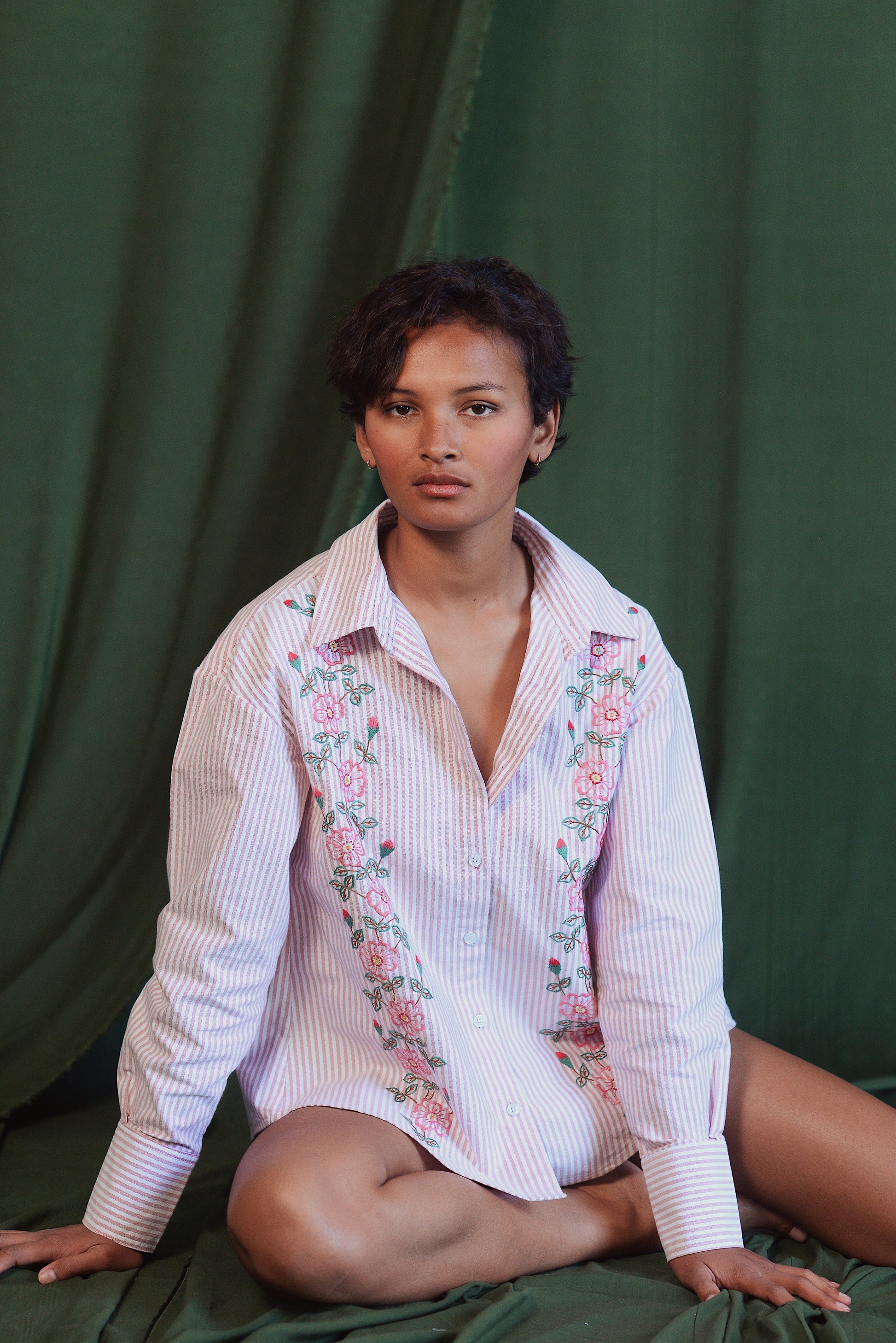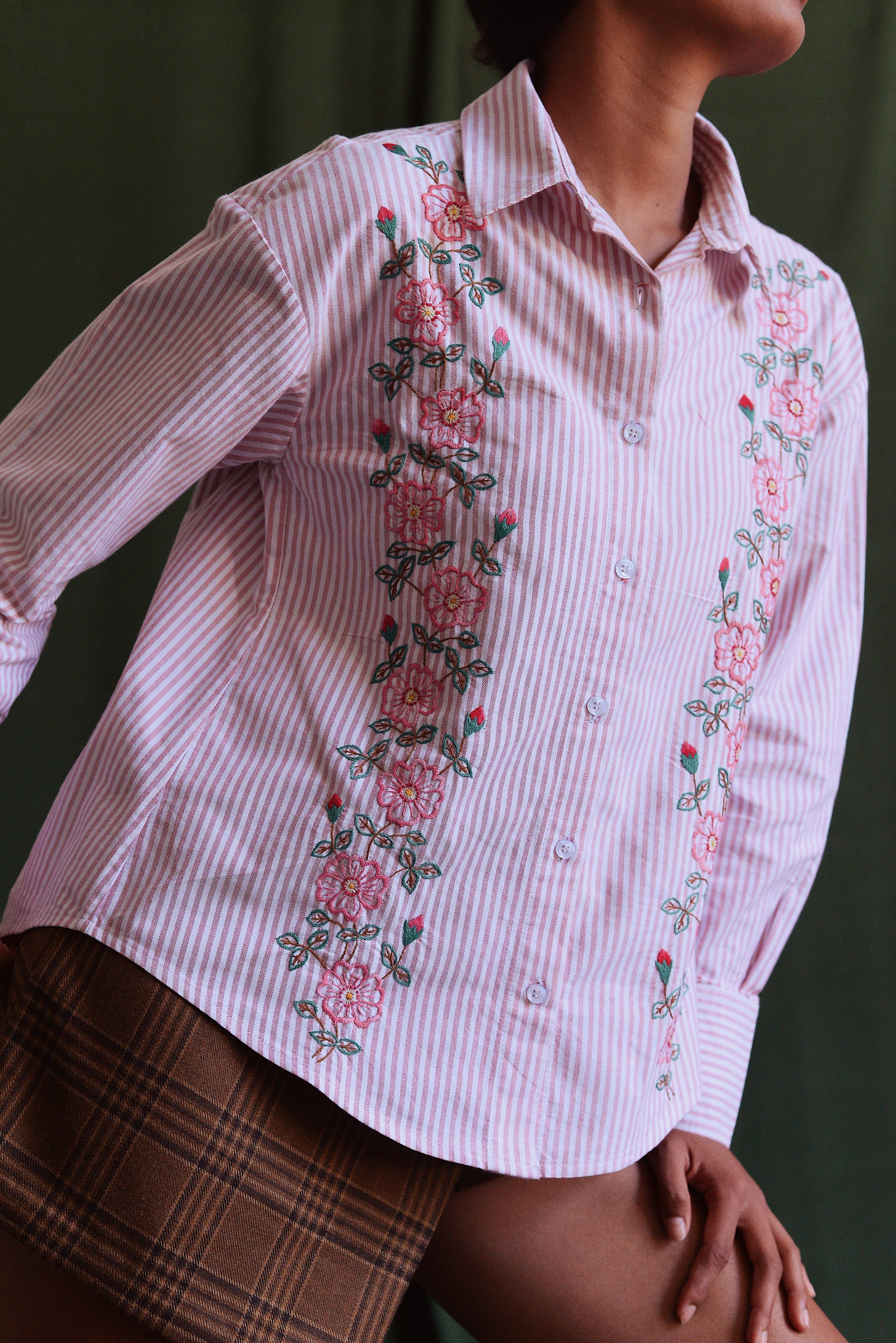 - Chemise rayé rose brodée de motifs floraux