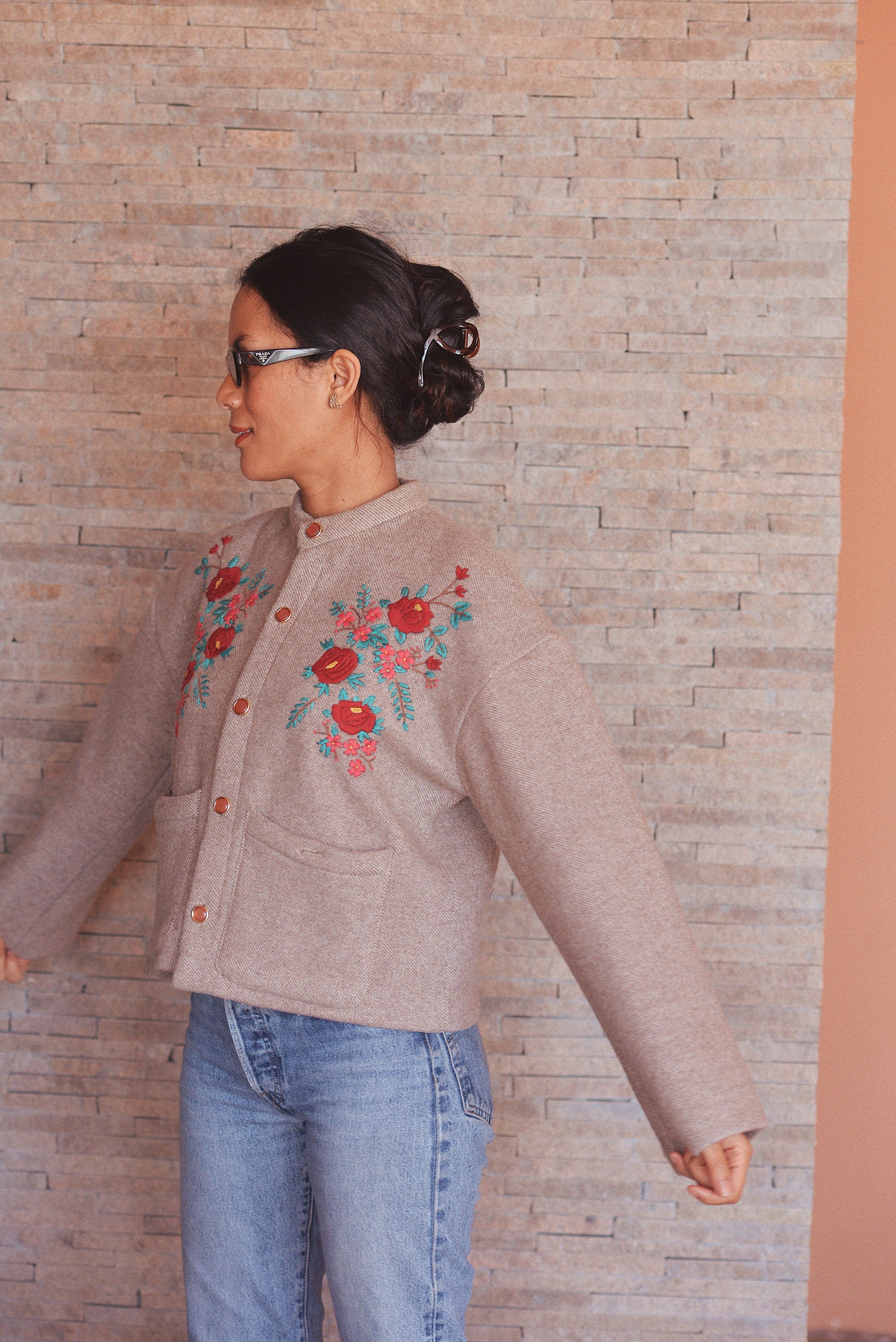 Gilet beige à broderies fleuries, une pièce délicate et lumineuse.