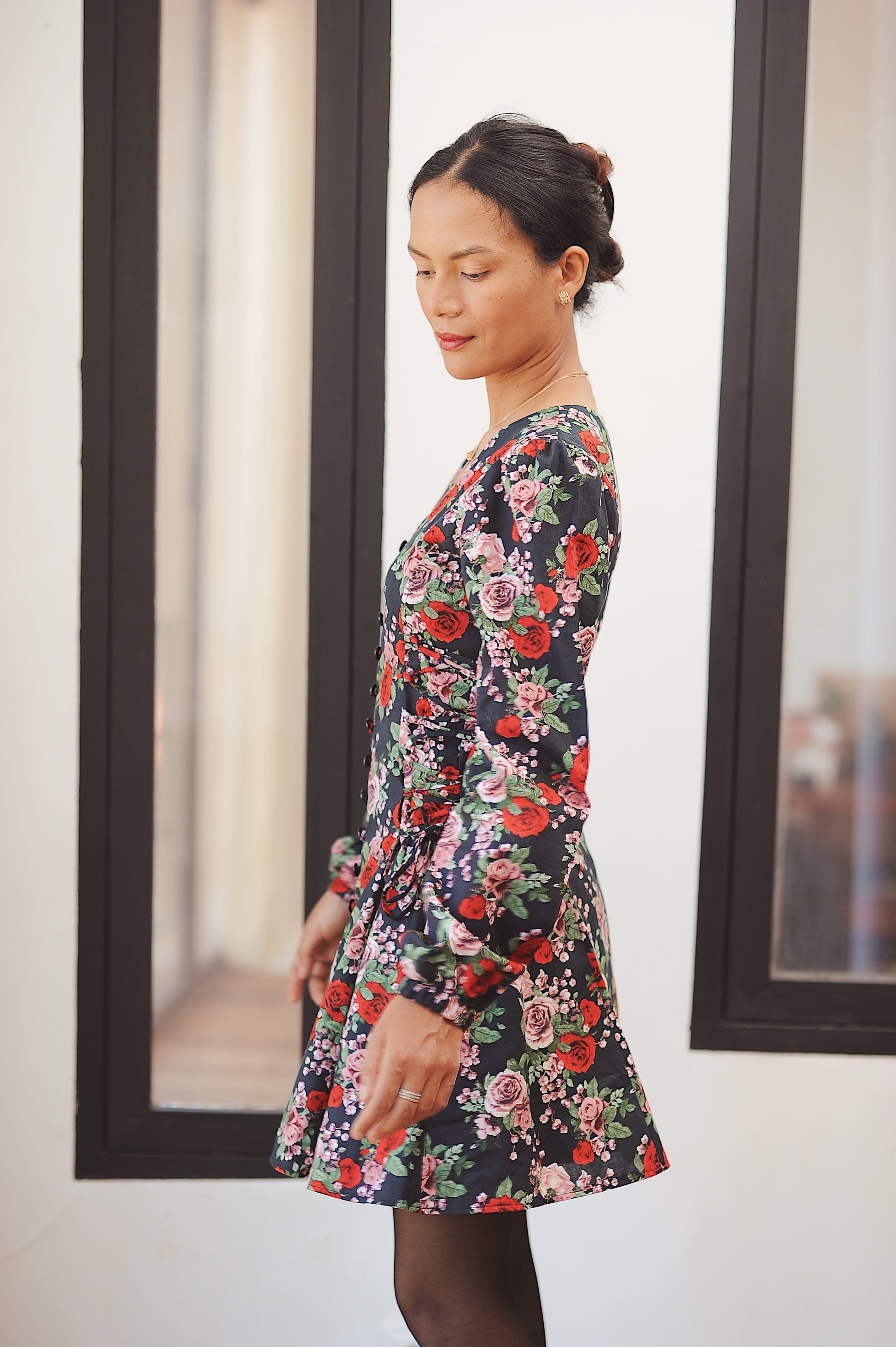 Robe noire en 100% coton, ornée d’un imprimé fleuri rouge et vert pour une allure féminine et intemporelle.
