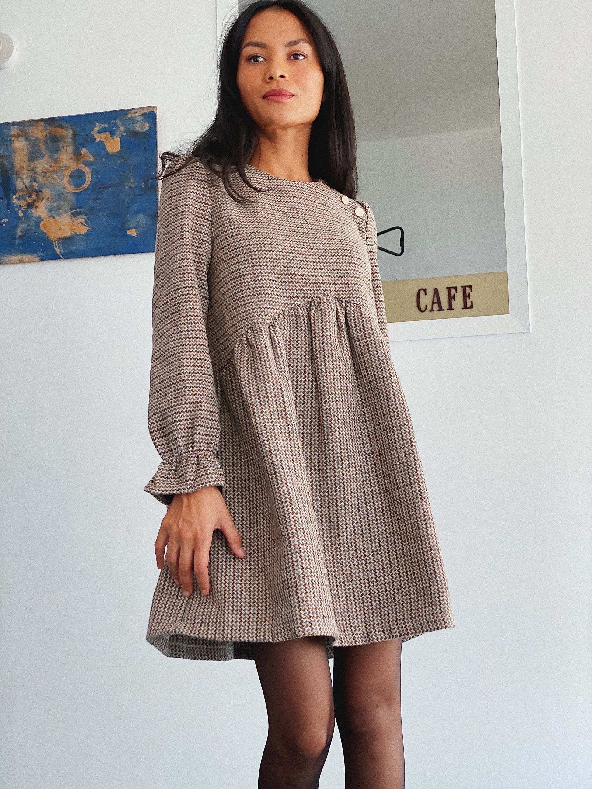 Tissée dans une laine douce et fluide, la robe Kalin a cette légèreté du vêtement qu’on garde toute la saison. Chaque pièce est confectionnée sur commande, dans notre atelier, point après point.
